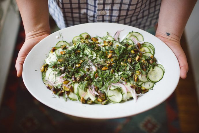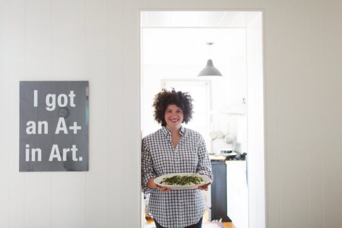 WHILE FOOD AS ART HAS LONG BEEN A HIGHLY REGARDED AS PART OF OUR CULTURE, cookbooks as art have grown to be a strong and steady contender on bookstore shelves, coffee tables and kitchen countertops. Leading the pack is author and chef Julia Turshen, relatively young in years but seasoned with experience, not to mention an impressive resume. She’s trekked Spain with Mario, feasted on kale with Gwyneth, and even explored kimchee with Jean Georges, all before the age of 30. With an education in poetry and a deep love for cookbooks as both lifestyle aspirations and educational bibles, Turshen’s clear voice and healthful approach is unmistakable in all her work. “I was always drawn to people teaching others how to cook,” the author explains over a freshly made salad of raw zucchini, red onion and toasted pistachio. “[I cook] from my influences of nostalgia and classic flavors,” she notes. “Things I remember eating, but I find a fresher, lighter variation.” In her sunny Greenpoint apartment, which she shares with her wife, Design Sponge founder Grace Bonney, and among a treasure trove of cookbooks and friendly pets, bonberi sat down with Turshen who delved into her latest project Buvette, which she co-wrote with chef Jody Williams (and launches today), her philosophy on cooking and eating, her bread loaf tattoo, as well as the important lessons she’s learned along the way.