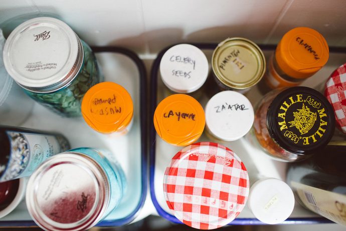 Olive oil, Maldon salt, any kind of chili, Aleppo pepper. I’ll settle for the chili pepper you get at pizza places, I just like anything that brings some heat. Popcorn kernels are a go-to. In the fridge always eggs, parmesan cheese, we have a very large variety of jam but we both only like raspberry Bonne Maman. I write the types on the lips so it’s easier to see when you are pulling them out. I love Cholula and Maille dijon mustard.